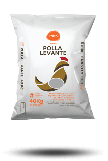 Es un alimento completo para ser suministrado como único alimento desde la 16 semana hasta que el 2% de postura. Distribuir el alimento 30% en la mañana y un 70% en la tarde. Siga al pie de la letra las instrucciones de uso. No utilice este alimento en especies, ni en etapas diferentes a las recomendadas. Almacenar en sitio cubierto con adecuada ventilación y sobre estibas.